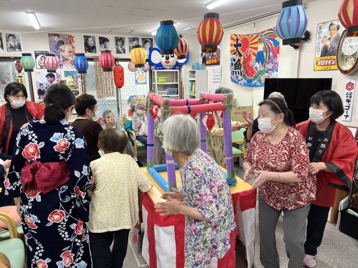 デイサービス内に定員3名のカラオケBOXがございますので、他の方へ気兼ねなく大きな声で歌っていただけます。室内にはミラーボールが設置され昭和の時代へタイムスリップ